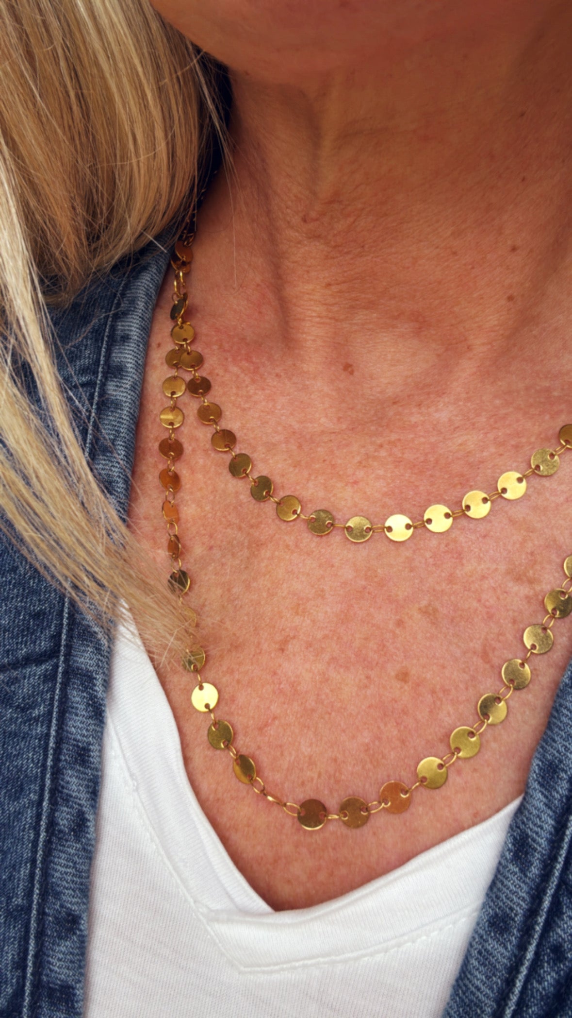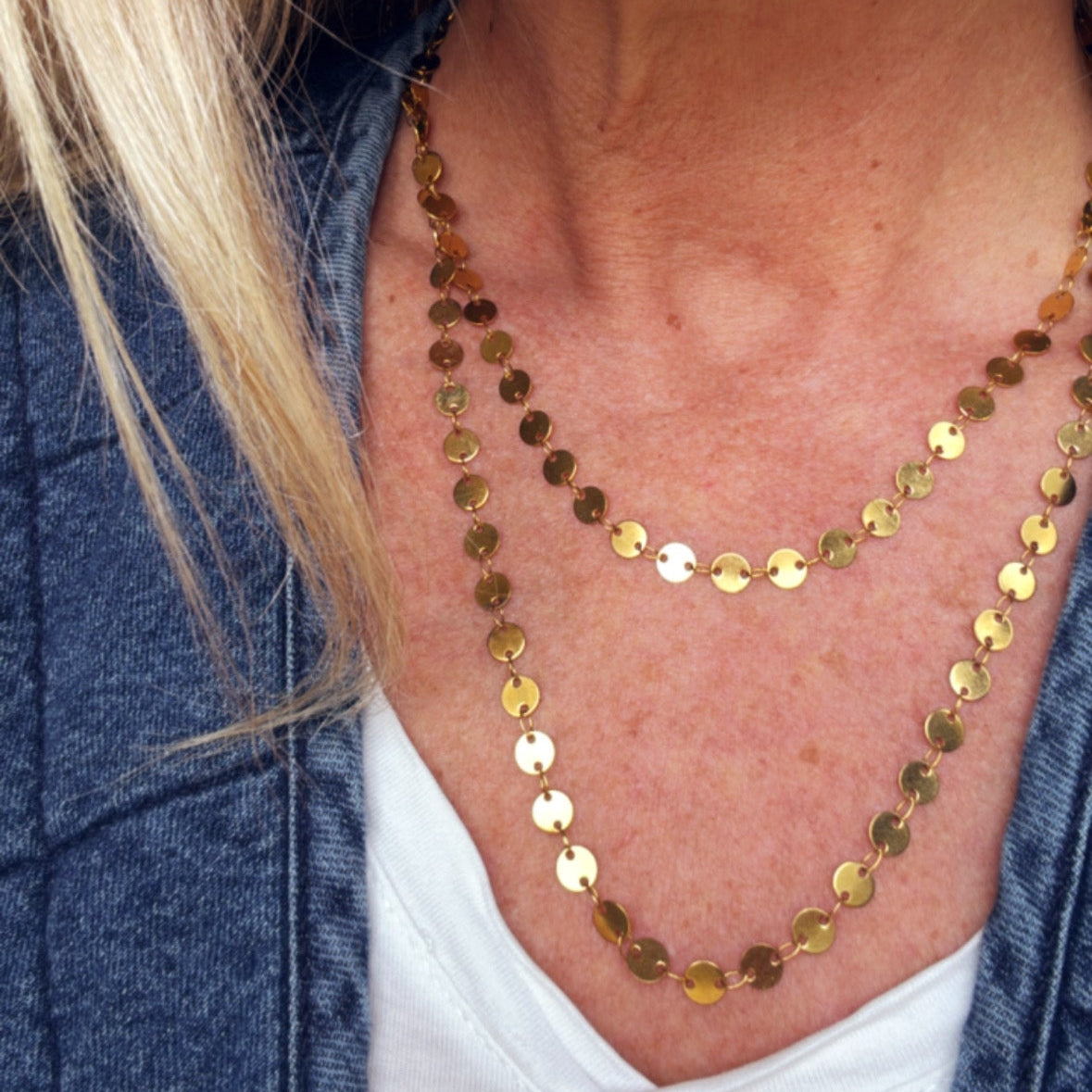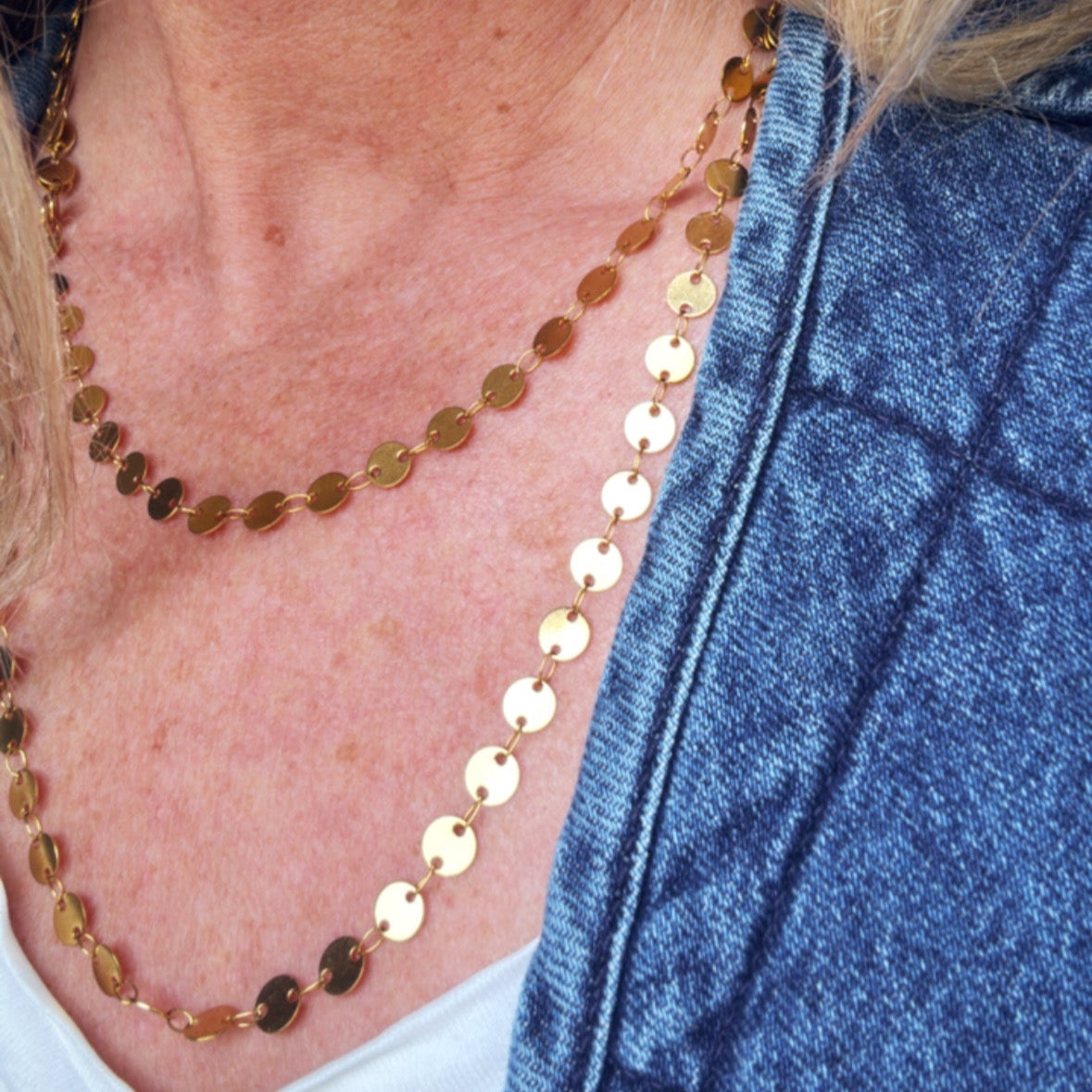My daughter Nancy ( 17 ) LOVES this necklace - its got a real boho vibe to it and can be worn as a double or a long single. Very light to wear indeed. Super delicate with lots of mini flat discs making up this striking necklace. Traditional clasp fastening. Only in gold.