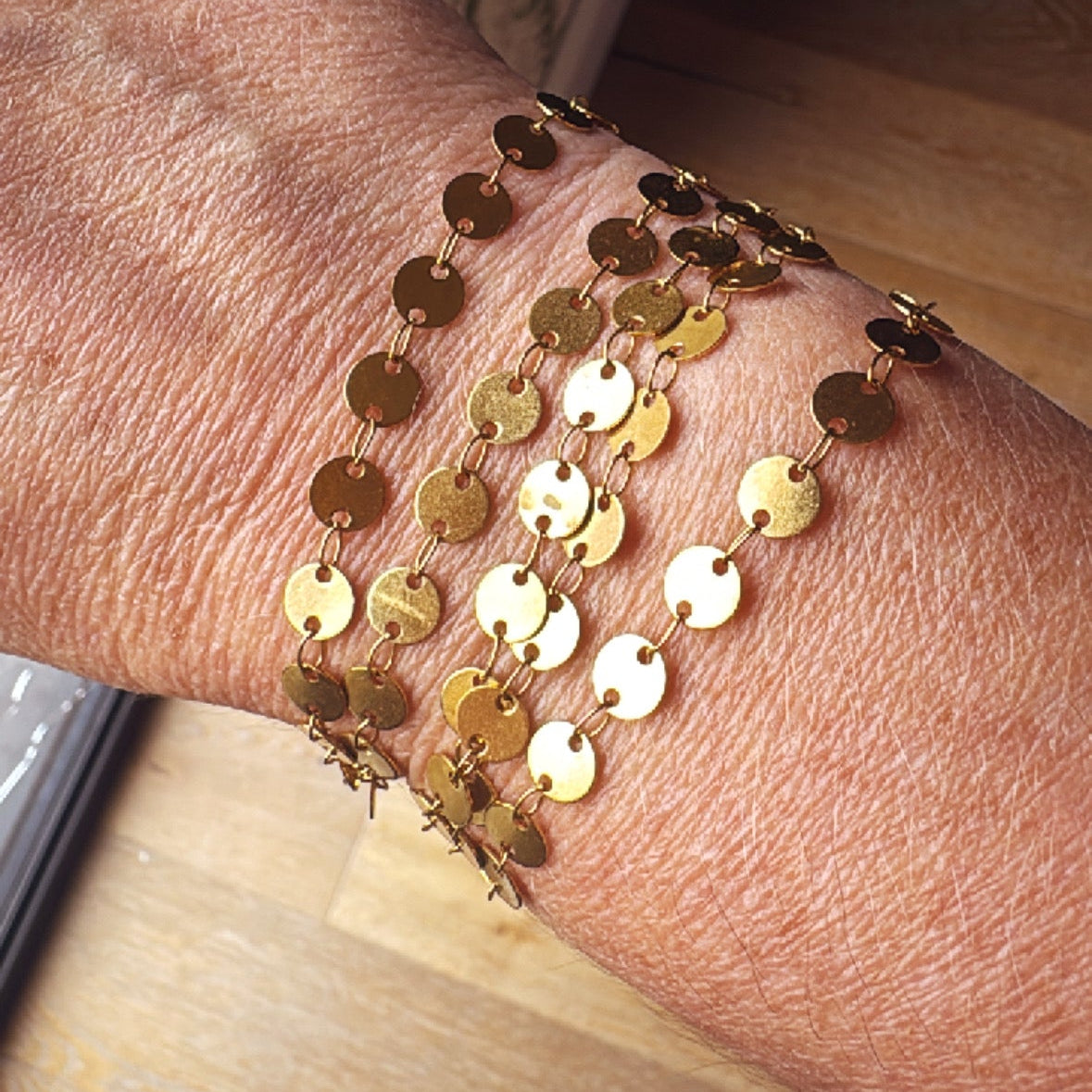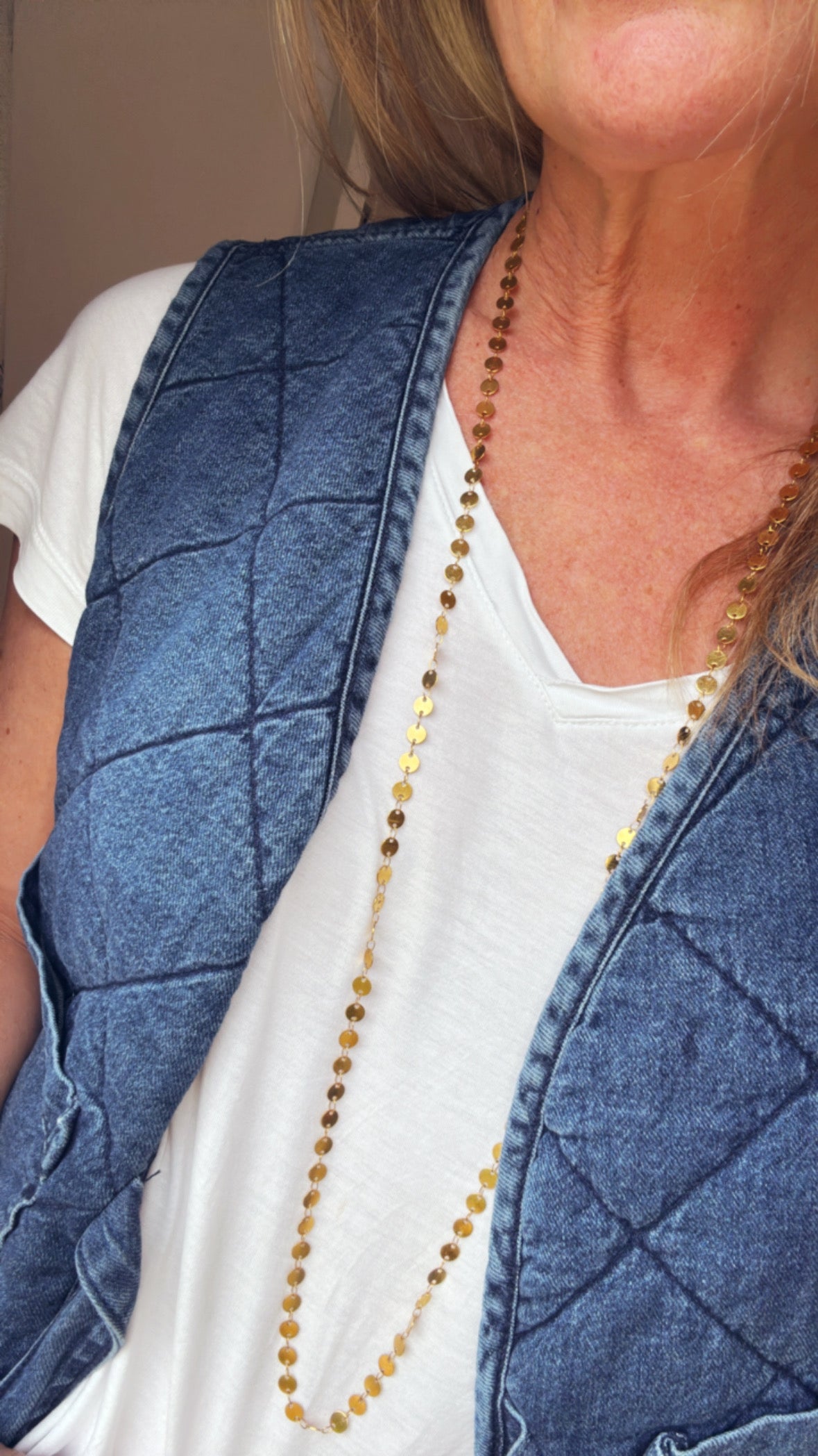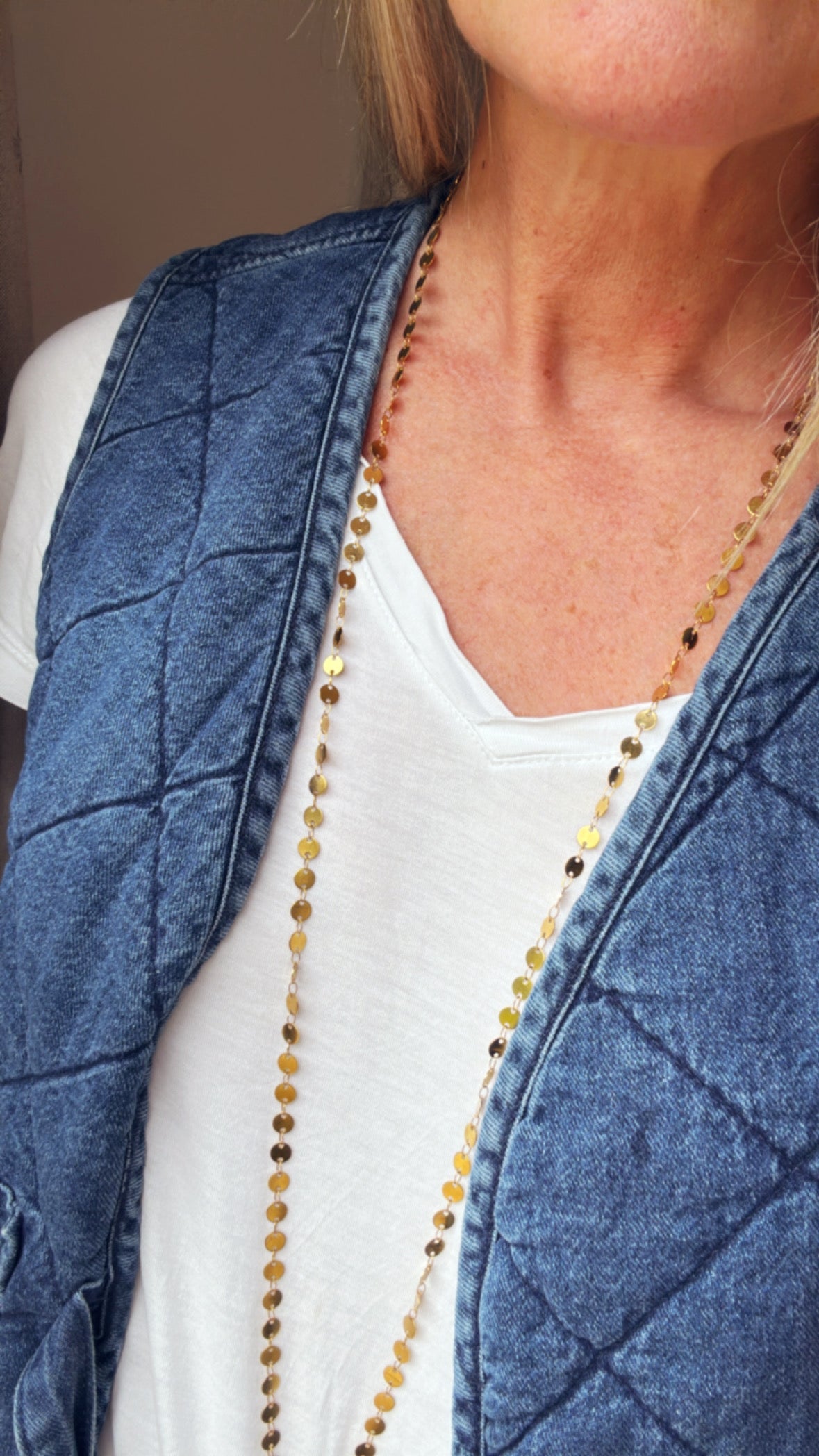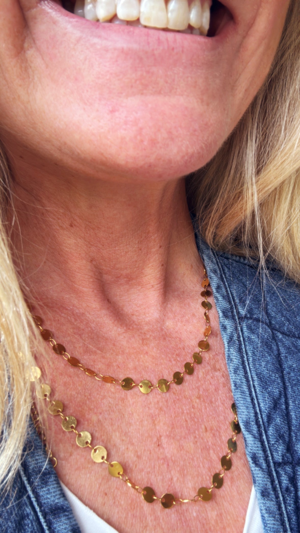 My daughter Nancy ( 17 ) LOVES this necklace - its got a real boho vibe to it and can be worn as a double or a long single. Very light to wear indeed. Super delicate with lots of mini flat discs making up this striking necklace. Traditional clasp fastening. Only in gold.