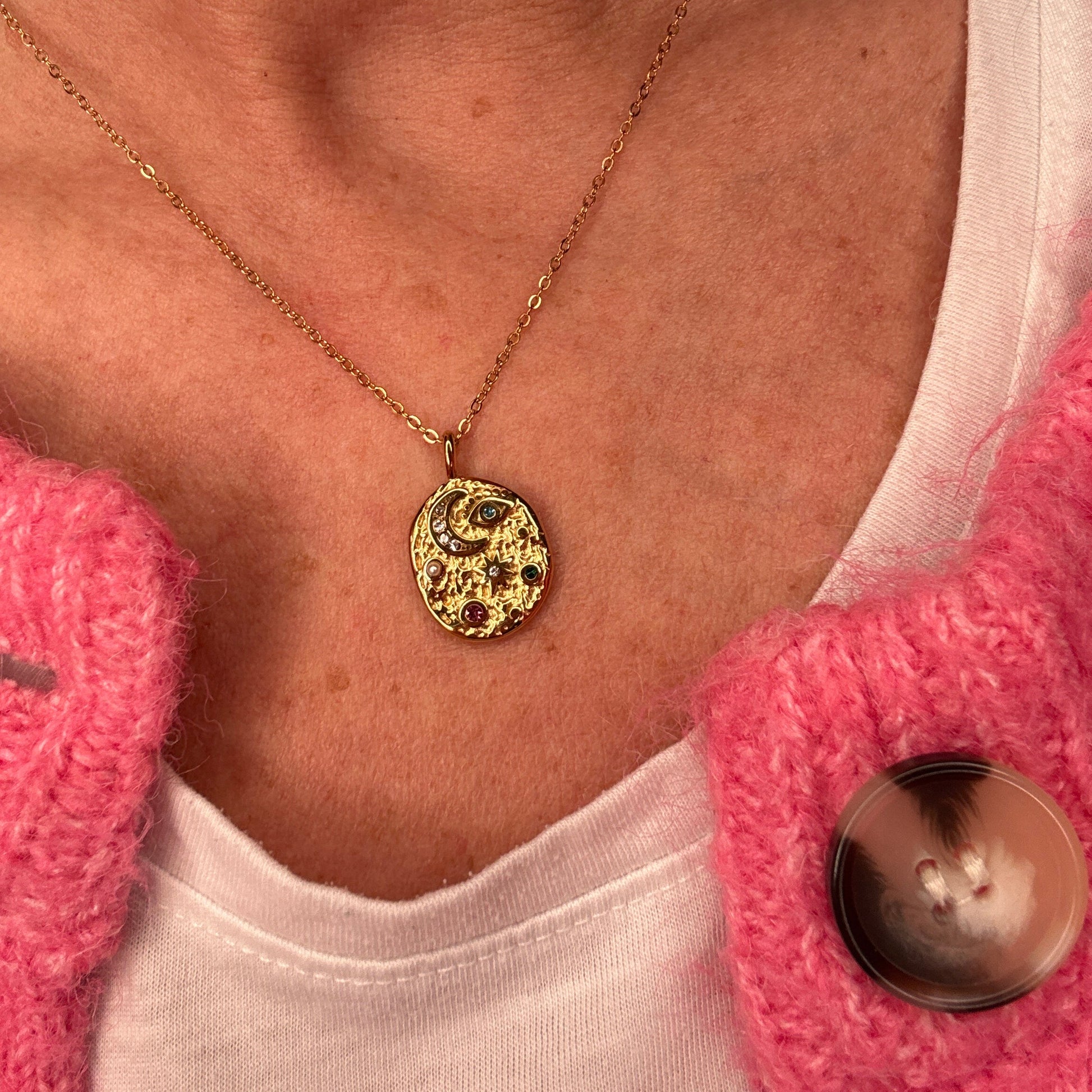 A delicate yet striking piece - a beautiful round imperfect edged disc with a moon and star and eye and several coloured sparkles.