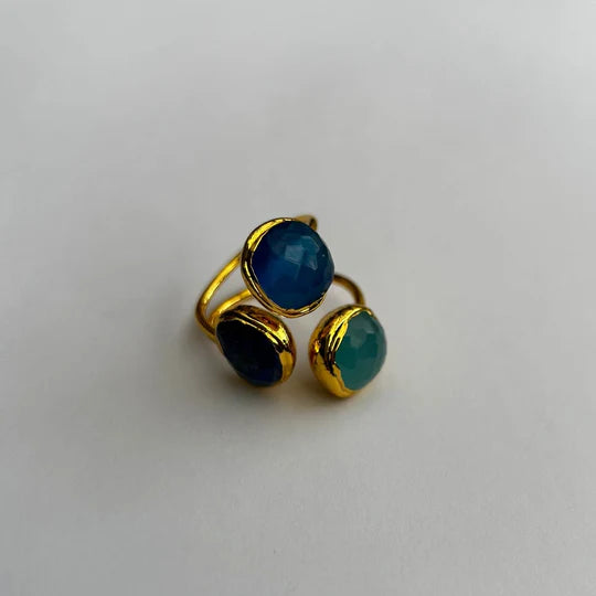 This ring is a trilogy of faceted blue semi precious stones, all set in gleaming gold plating. her ewe have blue and aqua chalcedony and denim jade - just stunning!