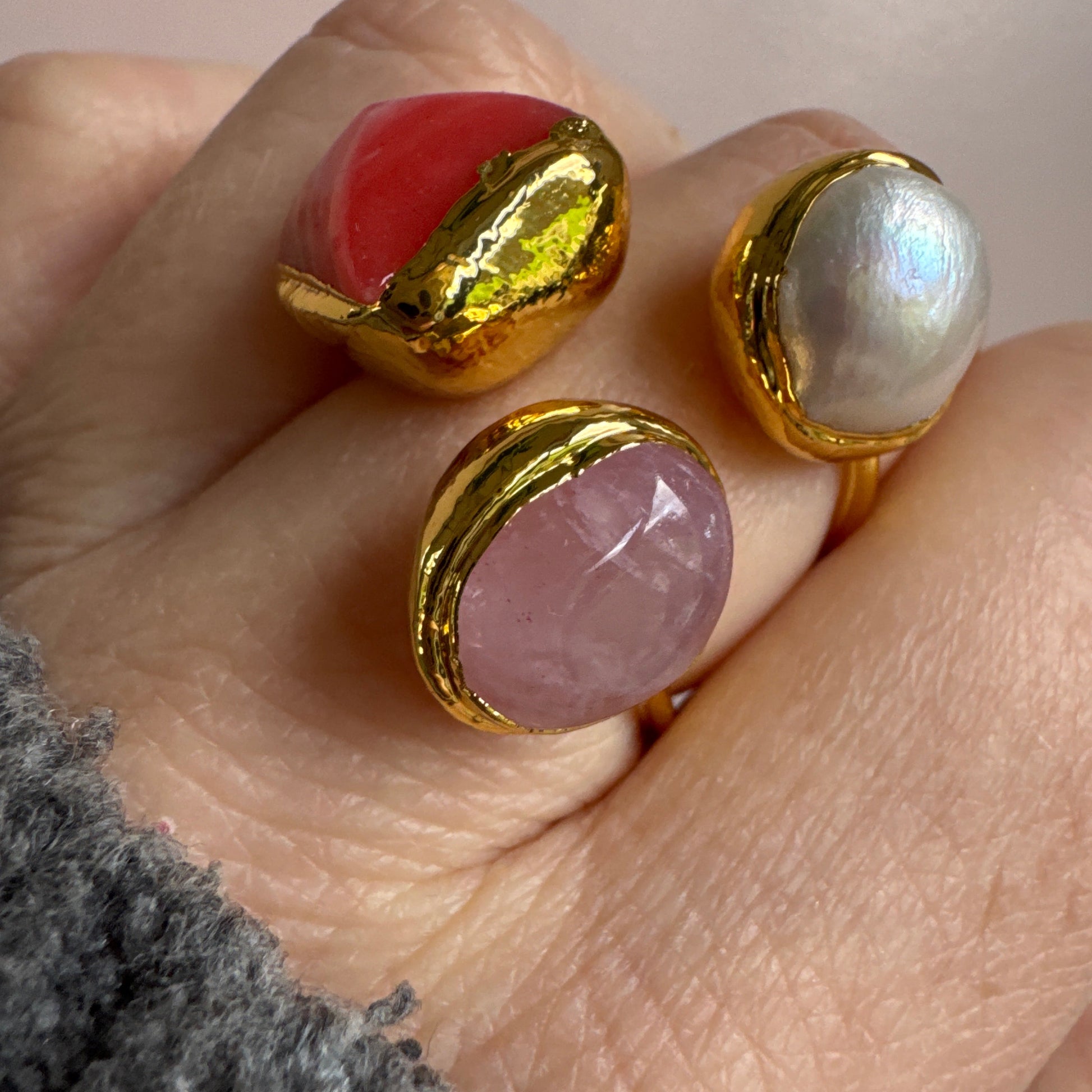 This ring is a trilogy of faceted pink semi precious stones, all set in gleaming gold plating. Here we have freshwater pearl, rose quarts and a pink gemstone. Sensational!